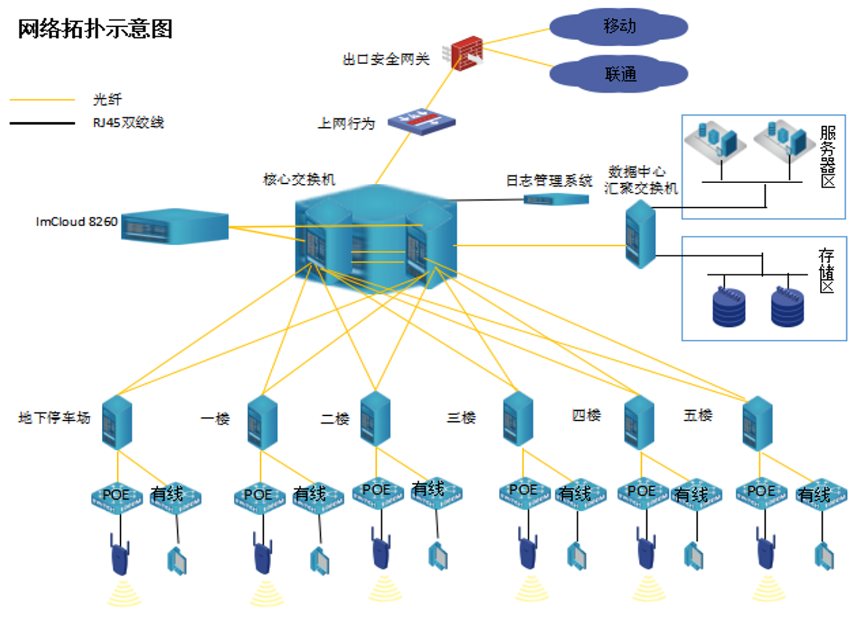 用户对商场内部有完成的规划,按照用户需求规划无线网络,有地下停车场为一个IP号段,1-2层一个IP号段,3-5层为一个IP号段给用户使用,对来宾使用无线网络时需要做短线认证方可正常使用无线网络。对内部员工使用非认证无线网络的办公网,对于卖场内的POS机设置专属的隐藏SSID仅对POS使用的无线网络。主要认证由我司ImCloud 8260设备来完成及实现无线漫游功能,DCWL-8200-I1设备主要覆盖商场内部工区位置。